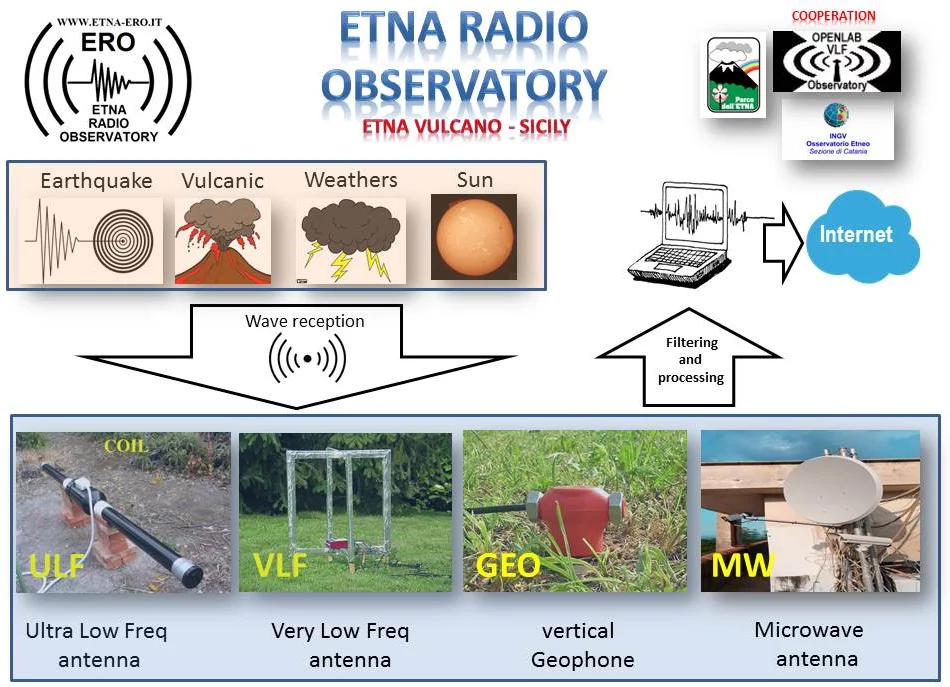 L’Istituto Nazionale di Geofisica e Vulcanologia – Osservatorio Etneo e l’Osservatorio Radio dell’Etna (Etna Radio Observatory – ERO) cooperano per l’osservazione e lo studio dei segnali elettromagnetici nelle bande ELF-VLF (da 0.1 Hz a 24 kHz) e nella banda delle microonde (intorno agli 11 GHz).