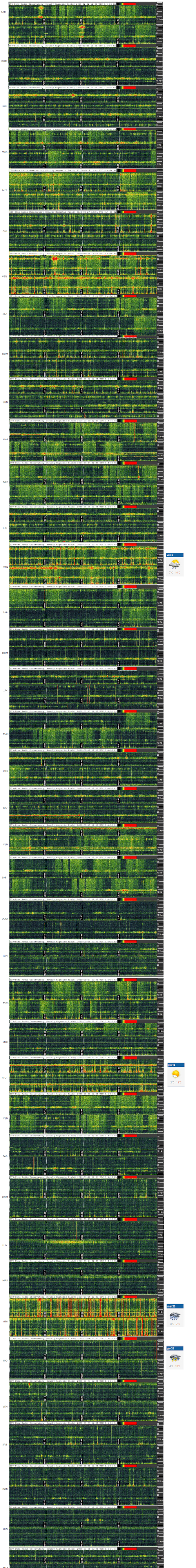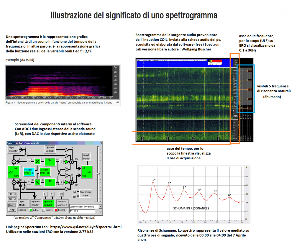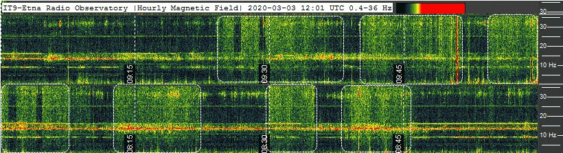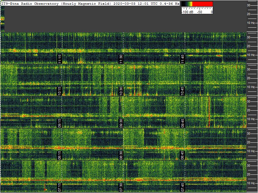 Abbiamo considerato gli spettrogrammi generati dalle registrazioni dell’induction COIL di Nicolosi dal 22 febbraio al 31 marzo (Figura 6), utilizzando il software gratuito Spectrum Lab. Ci siamo concentrati sui dati registrati tutte le mattine dalle 08:00 alle 10:00 (UTC), in quanto queste sono solitamente le ore affette dal maggiore disturbo antropico. Queste registrazioni sono state confrontate ed analizzate con l’obiettivo di capire se il blocco, o quantomeno la riduzione, delle attività produttive a causa dell’emergenza COVID-19 avesse influito sulla qualità dei segnali EM registrati dalla stazione, in che misura e con quali caratteristiche.