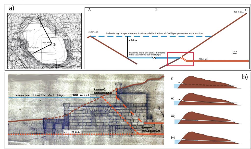 Perché questi fenomeni catastrofici potessero avvenire, tuttavia, le acque del lago avrebbero dovuto essere prossime al bordo craterico, come ipotizzato dai sostenitori di questa tesi. Lo studio delle caratteristiche costruttive dell’opera idraulica romana ha, però, dimostrato che il livello del lago al momento dello scavo non poteva essere superiore a quello del tunnel stesso, cioè ben 70 metri al di sotto del punto più basso dell’orlo craterico da cui dovrebbero tracimare le acque (Figura 4a). Gli autori di tale ipotesi, infatti, avevano posto come condizione necessaria per le tracimazioni che il livello del Lago Albano in epoca romana fosse molto più alto di quello attuale.