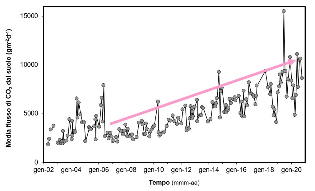 In particolare, i valori di flusso di CO2 dal suolo relativi alle campagne mensili di misura condotte all’interno del cratere della Solfatara, mostrano un aumento dei valori a partire dal 2006, compatibile con un processo di riscaldamento e pressurizzazione del sistema idrotermale dei Campi Flegrei (Figura 12).