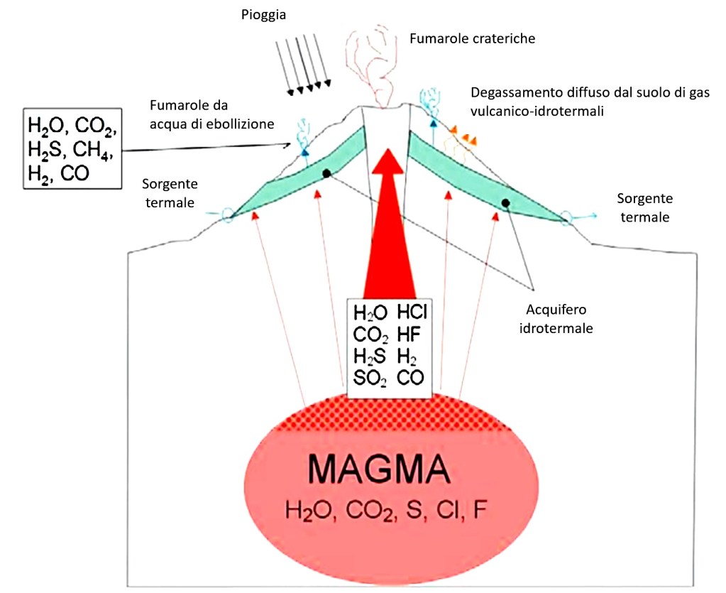 Il Vesuvio e la caldera dei Campi Flegrei vengono costantemente sorvegliati con tecniche di monitoraggio e di analisi sempre più innovative ed accurate. L’Osservatorio Vesuviano (OV), Sezione di Napoli dell’Istituto Nazionale di Geofisica e Vulcanologia (INGV), svolge in prima linea la sorveglianza dello stato di attività dei vulcani campani. Tra le varie attività di monitoraggio, quello geochimico si occupa di definire e caratterizzare i “fluidi vulcanici” al fine di comprenderne l’origine e la circolazione all’interno del sistema vulcanico. Tali fluidi sono costituiti prevalentemente da acqua, vapore acqueo, anidride carbonica (CO2), specie dello zolfo (SO2, H2S) e alogeni (HCl, HF). Queste sostanze possono essere rilasciate attraverso l’attività fumarolica, essere emesse diffusamente attraverso il suolo o da bocche eruttive così come possono essere disciolte all’interno di un acquifero idrotermale interposto tra un magma in profondità e la superficie (Figura 4).
