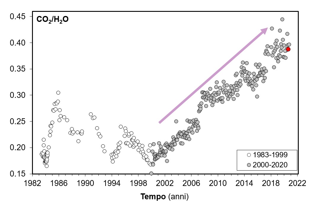Il monitoraggio geochimico della Solfatara di Pozzuoli (Campi Flegrei) è iniziato nel 1982-1985 con lo studio sistematico delle principali fumarole presenti al suo interno. I risultati del monitoraggio mostrano a partire dall’anno 2000 un aumento del rapporto CO2/H2O delle fumarole Bocca Grande e Bocca Nuova (Figura 10). Tale aumento è probabilmente legato ad un aumento del flusso dei fluidi magmatici (e della pressione) e allo stato termico del sistema, che innesca possibili processi di condensazione del vapore nel sistema idrotermale, influenzando il rapporto CO2/H2O misurato nelle fumarole.