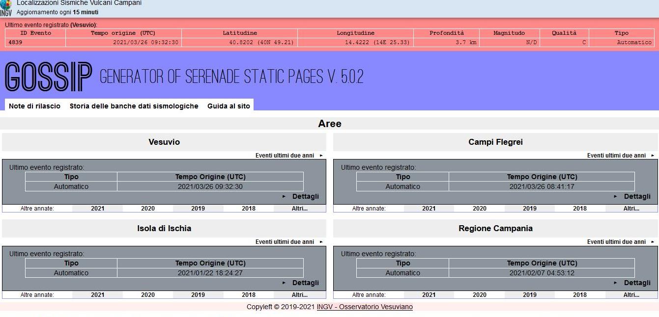 GOSSIP (acronimo di Generator of Serenade StatIc Pages) dal marzo 2020 permette di visualizzare e scaricare i principali parametri relativi agli eventi sismici avvenuti nelle aree vulcaniche campane e contenuti nella banca dati sismologica SERENADE. GOSSIP è completamente fruibile sia per l’utilizzo da PC desktop che per l’utilizzo da smartphone e tablet. Ne parleremo in dettaglio in un prossimo articolo.