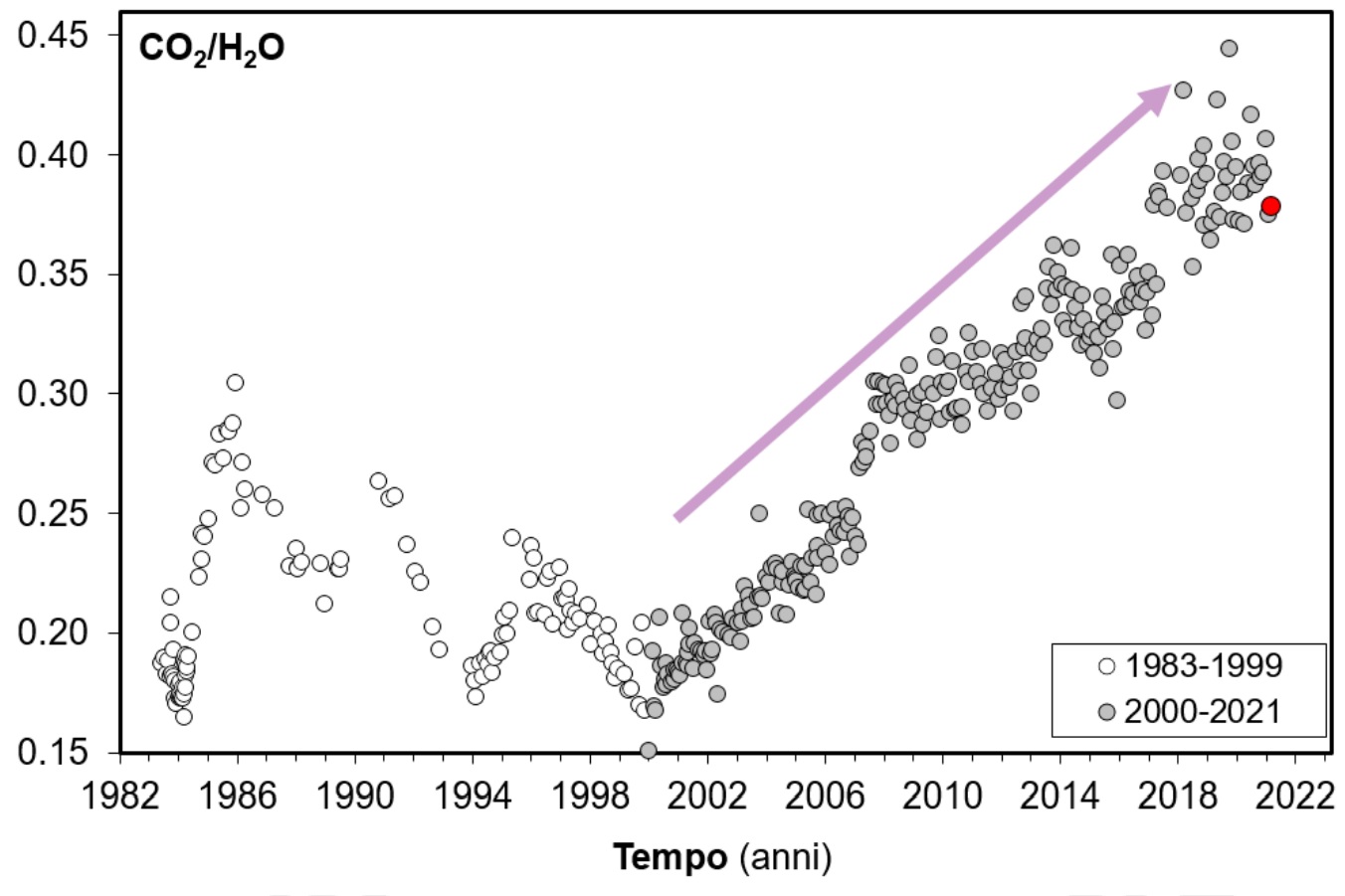 Nel dettaglio, dal 1983 fino al 2000, il rapporto CO2/H2O nelle fumarole ha mostrato picchi che hanno sistematicamente seguito gli eventi bradisismici (quelli del 1983-1985 e due eventi minori nel 1989 e nel 1996) e che sono stati interpretati come la manifestazione superficiale di iniezioni di gas magmatici nel sistema idrotermale che alimenta le fumarole (Figura 4).