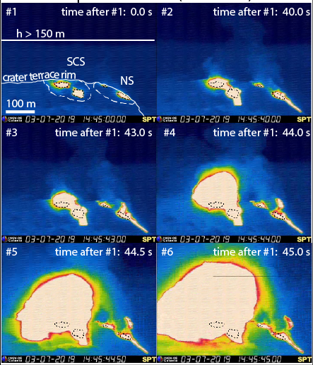 Dall’analisi delle immagini della videosorveglianza sono stati inoltre ricavati parametri relativi alle condizioni pre-eruttive, che mostrano come intensità e frequenza dell’attività esplosiva normale a Stromboli abbiano subito una repentina variazione circa un mese prima del primo parossismo, in coincidenza con la variazione di altri parametri (geochimici e geofisici) rilevati a partire dallo stesso periodo. Tale osservazione indica che la ‘perturbazione’ del sistema magmatico che è poi culminata nelle manifestazioni esplosive di luglio-agosto 2019, è iniziata settimane prima dei due eventi parossistici.