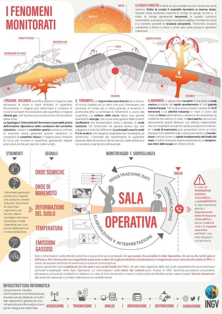 L’INGV ha fra i suoi compiti quello di monitorare il territorio italiano e garantire la sorveglianza sismica, vulcanica e l’allerta in caso di maremoti. Questo compito è svolto grazie all’azione sinergica delle sue Sale Operative.