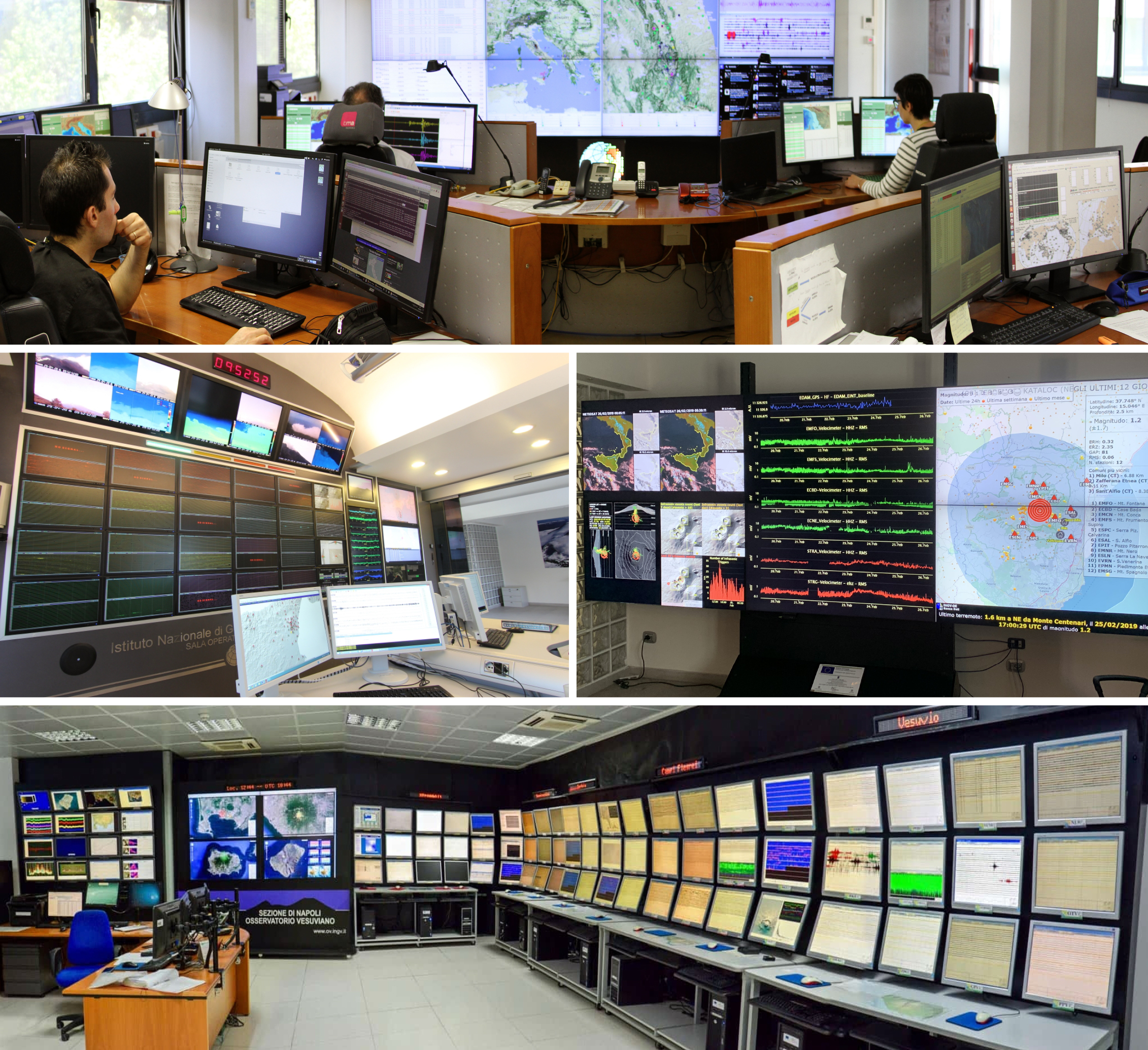 L’INGV ha tre Sale Operative. La prima è gestita dall’Osservatorio Nazionale Terremoti a Roma ed effettua il Servizio di Sorveglianza Sismica su tutto il territorio nazionale e l’Allerta per i Maremoti nel bacino euro-mediterraneo; la seconda, presso l’Osservatorio Vesuviano di Napoli, effettua il monitoraggio delle aree vulcaniche del Vesuvio, dei Campi Flegrei e dell’isola d’Ischia; la terza, presso l’Osservatorio Etneo a Catania, sorveglia i vulcani siciliani (Etna e Isole Eolie).