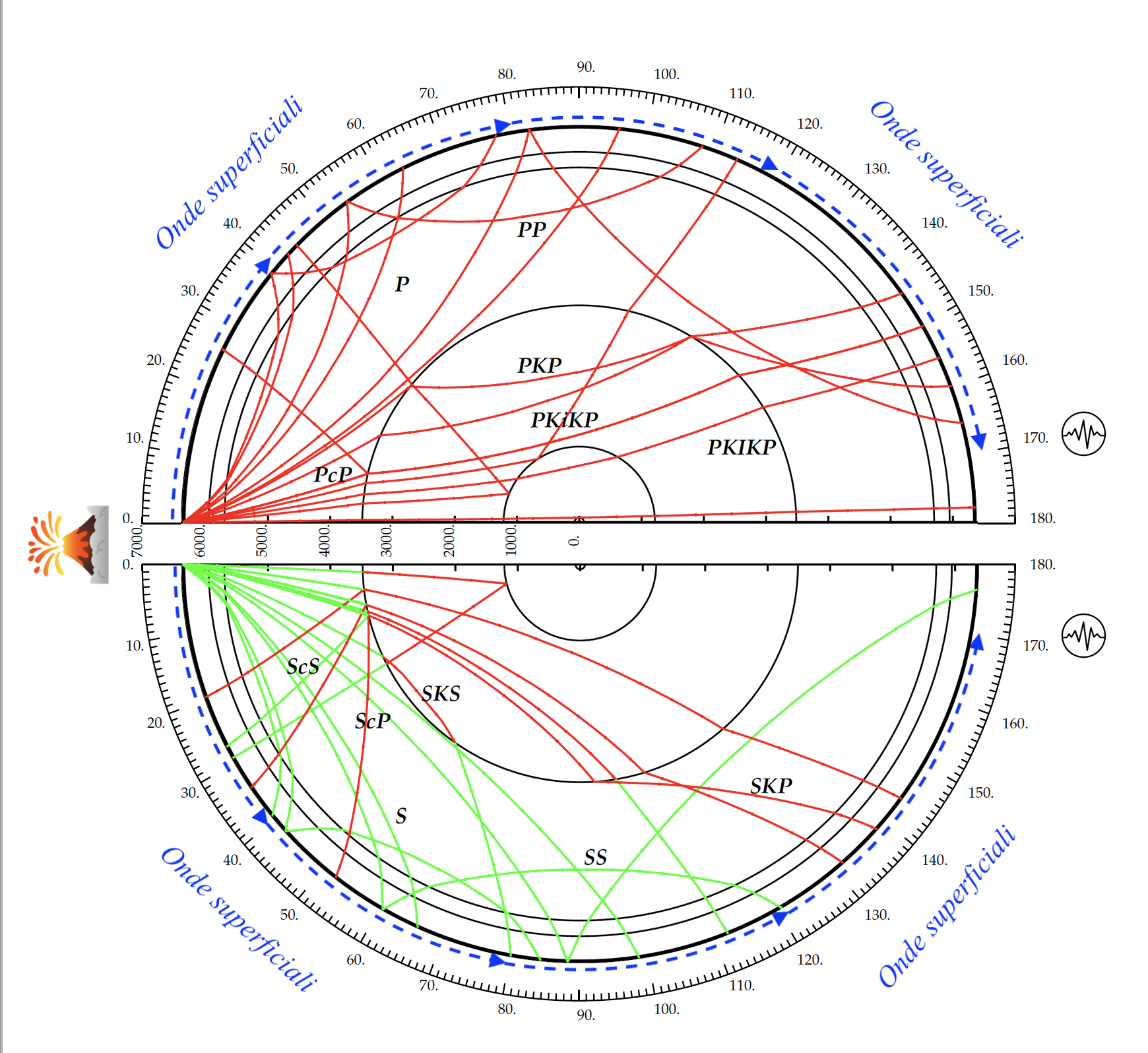 Il secondo arrivo osservabile nei sismogrammi della figura 2 è la fase PKP, che ha attraversato il mantello terrestre come onda P, per poi viaggiare nel nucleo esterno (K) e per arrivare alla stazione sismica attraversando il mantello (Figura 3)