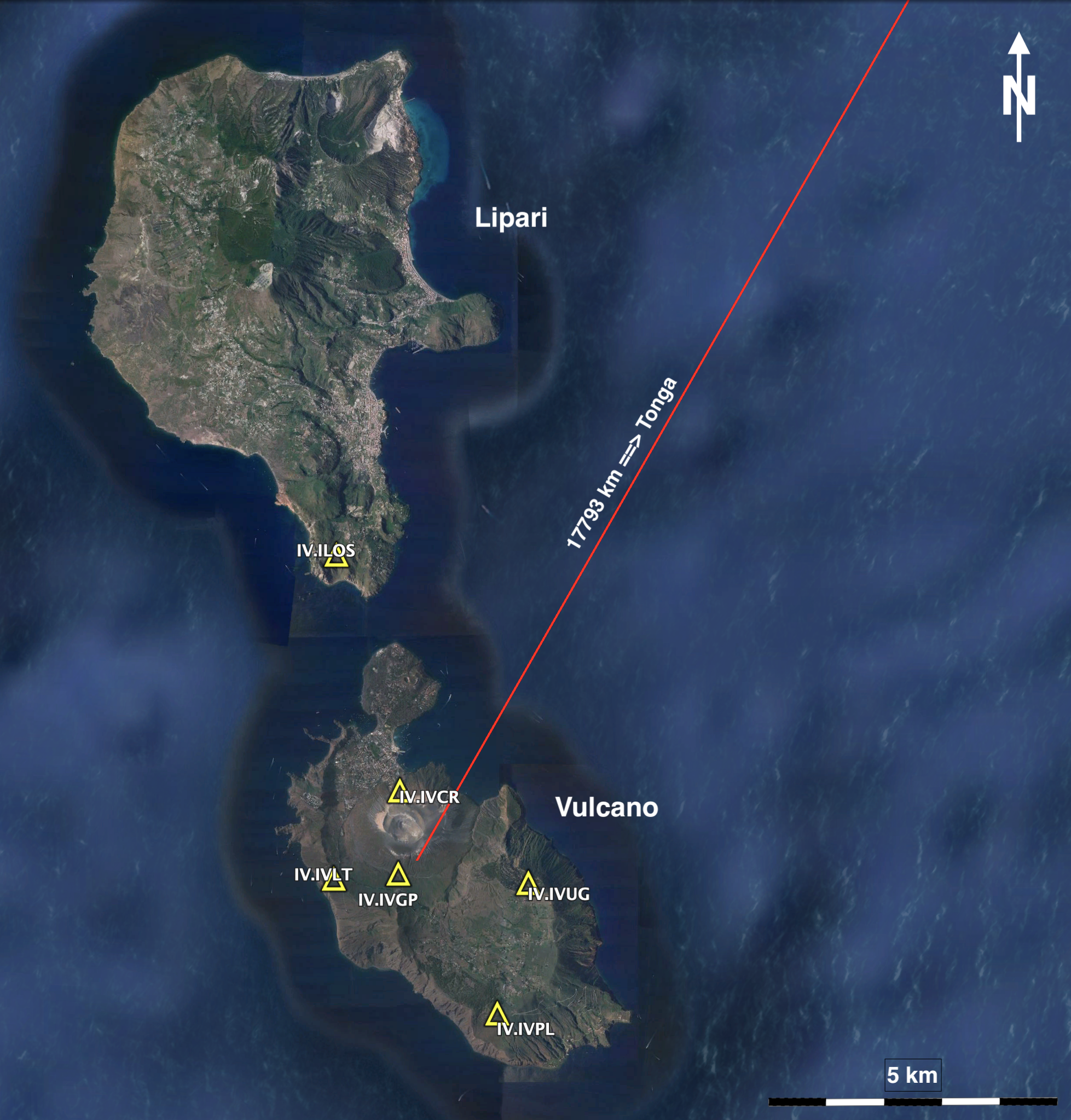 La figura 2 illustra, ad esempio, i sismogrammi registrati ad alcune delle stazioni installate alle isole Eolie (contrassegnate dalle sigle ILOS, IVCR, IVGP, IVLT, IVPL, IVUG nella Figura 1). La distanza epicentrale tra Tonga e le isole Eolie è all’incirca 160°, che equivale a 17800 km (Figura 3).