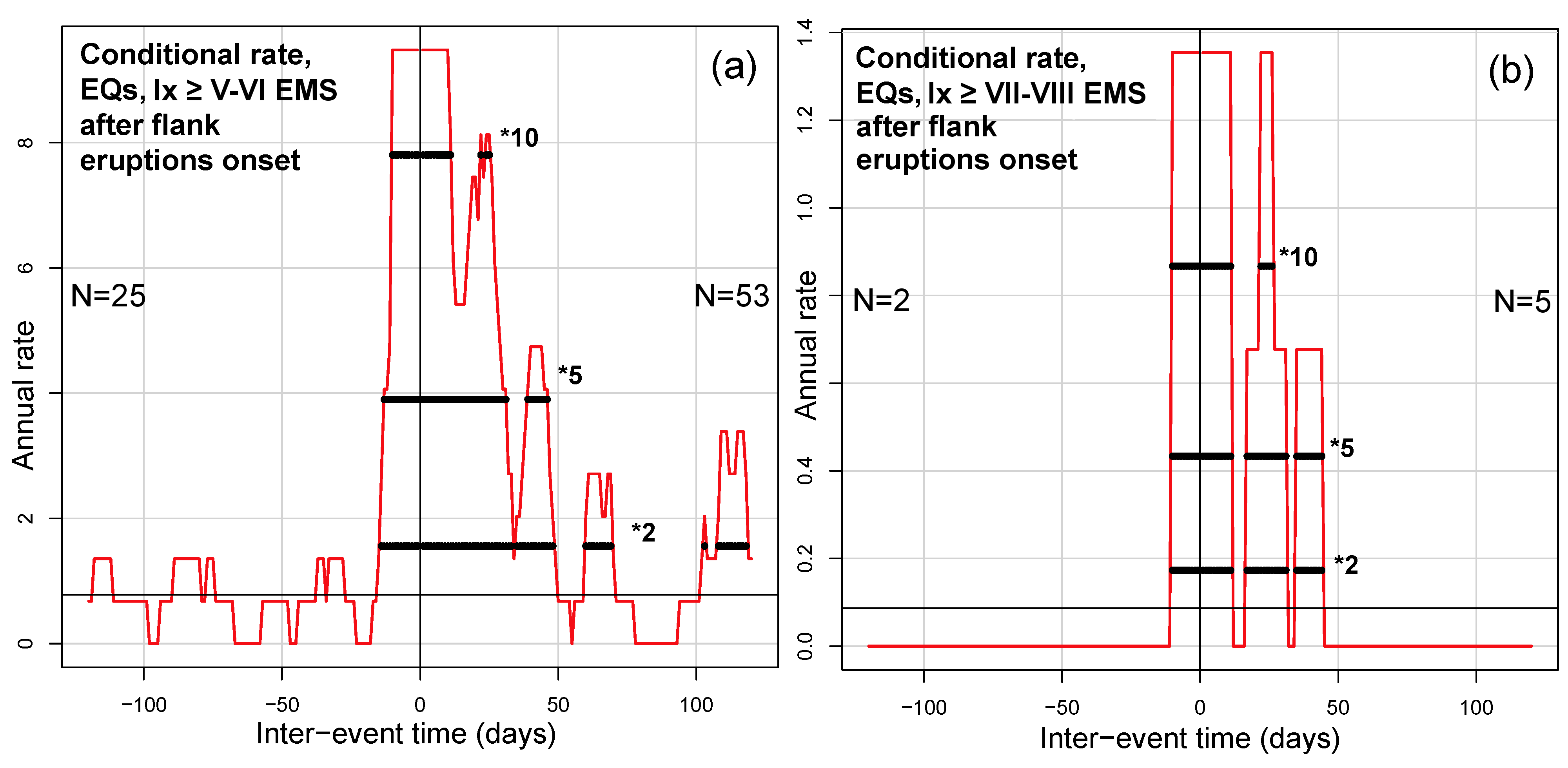 The following question rises naturally: “How much greater is the probability of the earthquakes after a flank eruption, if compared to the average?”