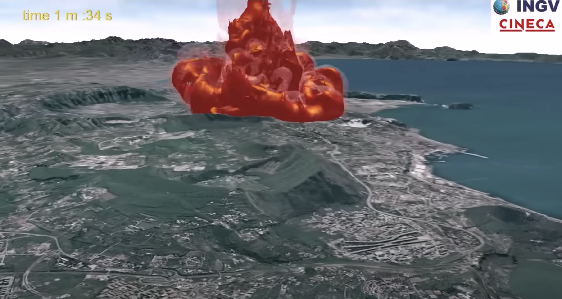 La simulazione riportata nel video, ad esempio, è stata realizzata per descrivere una grande eruzione analoga a quella avvenuta ai Campi Flegrei circa 4500 anni fa: l’eruzione cosiddetta di Agnano-Monte Spina. Per rappresentarla, la bocca eruttiva è stata posizionata al centro della conca di Agnano. Si tratta di un’eruzione di grande scala, tra le più grandi degli ultimi 15000 anni, con un flusso di materiale eruttato dell’ordine di 108 kg/s (ossia 100000 tonnellate al secondo). Eruzioni di questa grandezza vengono definite pliniane, per analogia con l’eruzione del Vesuvio del 79 dC, che fu descritta da Plinio il Giovane. Eruzioni così grandi non sono frequenti: ai Campi Flegrei; negli ultimi 15000 anni ci sono stati solo 3 o 4 eventi di questa scala su un totale di circa 70 eruzioni. È quindi poco probabile che un’eventuale ripresa dell’attività eruttiva ai Campi Flegrei avvenga con un’eruzione di grande scala.