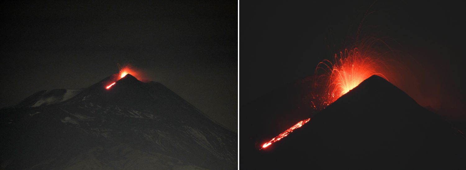 Nella mattinata del 10 novembre, da un punto localizzato poco sotto la “bocca della sella”, sul fianco sud-sud ovest del cono del Cratere di Sud-Est, una piccolissima lingua di lava ha cominciato ad avanzare qualche decina di metri, arrestandosi quasi subito; nel tardo pomeriggio è avvenuto un nuovo, altrettanto piccolo trabocco (Figura 2). Nel frattempo l’attività stromboliana si stava intensificando e finalmente anche il tremore vulcanico è aumentato in ampiezza, un segnale osservato centinaia di volte durante le fasi preparatorie di episodi di fontana di lava.