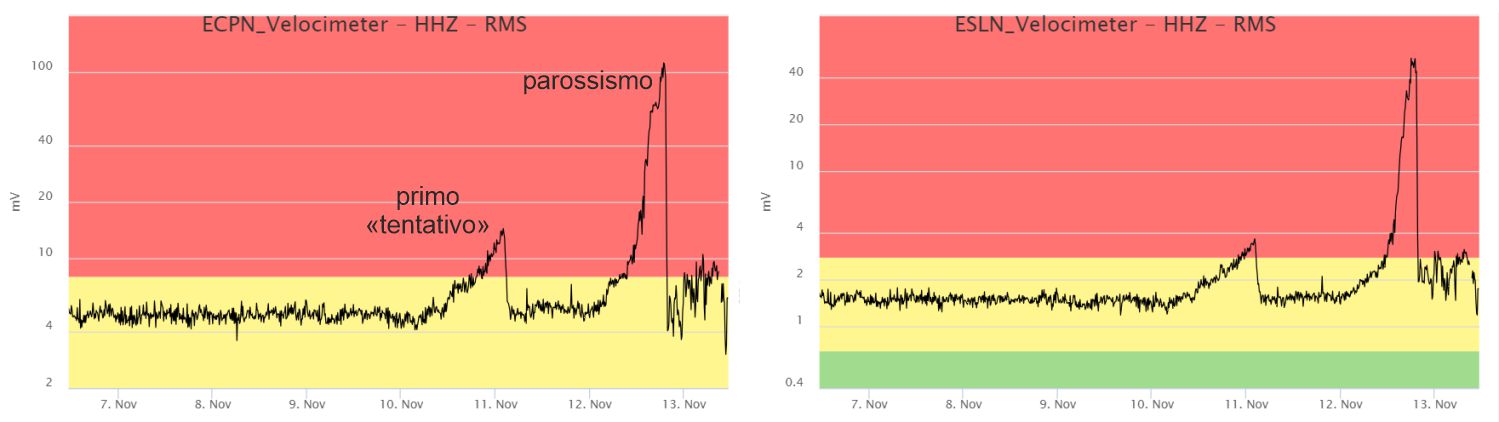 Durante la serata, però, sull’area sommitale del vulcano si è formata una densa coltre nuvolosa, che ha precluso ulteriori osservazioni dell’attività. La fine di questa “prova di parossismo” è stata pertanto desunta da dati strumentali, in particolare dalla rapida diminuzione di ampiezza del tremore vulcanico, che in pochissimo tempo è tornata su livelli simili a quelli precedenti al 10 novembre (Figura 3).