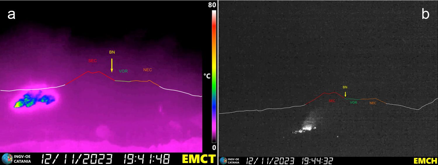 Nella serata del 12 novembre 2023 l’Etna è tornata in eruzione, con spettacolari fontane di lava alte centinaia di metri e una densa nube eruttiva carica di materiale piroclastico (cenere e lapilli), che è ricaduto in uno stretto settore sul versante orientale del vulcano. Questo è stato il terzo episodio parossistico nell’anno 2023, dopo quelli del 21 maggio (evento completamente invisibile a causa delle cattive condizioni meteorologiche) e del 13-14 agosto.