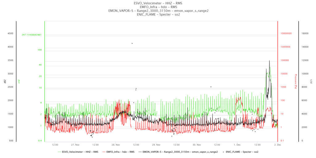 Ricordiamo che dal 19 novembre erano avvenuti più di 250 brevi episodi di attività stromboliana, separati da intervalli di completa calma (figura 2). L’ultimo episodio di debole attività stromboliana, uguale a quelli precedenti, è avvenuto tra le 16:35 (ora locale) e le 16:45, dopodiché l’attività si era arrestata. Contemporaneamente l’ampiezza del tremore ha cominciato a diminuire repentinamente, come era avvenuto anche tutte le altre volte.