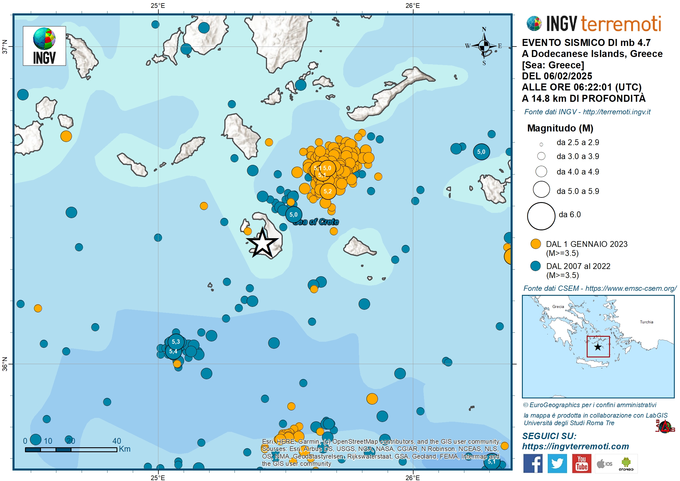 Da fine gennaio, un’intensa attività sismica ha interessato le Isole Cicladi, nell’area compresa tra le isole greche di Santorini e Amorgos. Lo sciame è iniziato il 27 gennaio con eventi di magnitudo inferiore a 3 e dal 29 gennaio la magnitudo delle scosse è aumentata, fino a raggiungere il valore massimo Mw 5.2 (Figura 1), con numerosi eventi avvertiti nelle isole circostanti e nella città di Atene e a Creta. Alla data di oggi, 5 febbraio 2025 (ore 14), sono stati registrati 1028 terremoti con magnitudo maggiore di 2, di questi 90 hanno magnitudo compresa tra 4.0 e 4.9 e 3 pari o superiore a 5.0; la profondità massima è 35 km e la minima di 2 km: la maggior parte dei terremoti ha una profondità che si attesta sui 10 km.