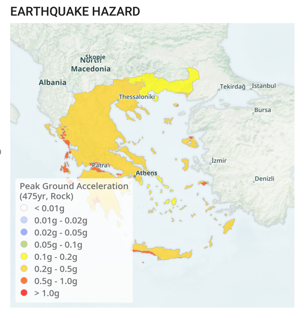 Il modello di pericolosità sismica per la Grecia mostra una pericolosità alta su tutto il territorio nazionale (Figura 7). Quest’area è caratterizzata da una storia di eventi distruttivi e da un’elevata pericolosità sismica. La combinazione di tettonica attiva e presenza di faglie sottomarine implica un rischio significativo di terremoti di grande magnitudo, con potenziali impatti sulle comunità costiere e sulle infrastrutture locali. La possibilità di fenomeni secondari, come tsunami o instabilità del fondale marino con associate frane sottomarine come pure frane sismoindotte in superficie rappresentano un ulteriore elemento di vulnerabilità per la regione. Allo stato attuale, sono già state segnalate frane a Santorini che hanno necessitato l’intervento delle autorità di protezione civile.