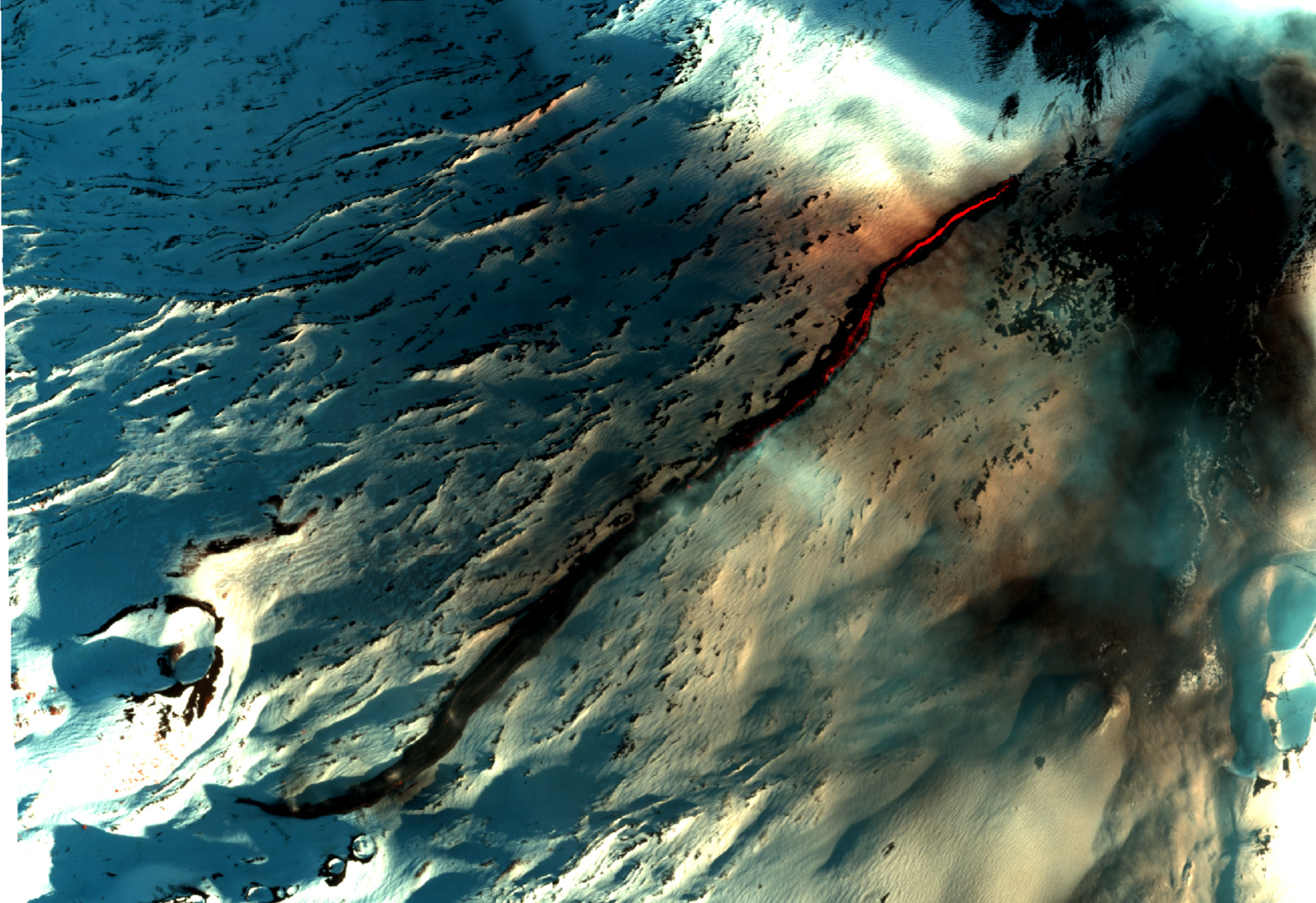 La fotografia esposta in Figura 1 rappresenta un’immagine RGB composita (Near Infrared, Verde, Blu) acquisita dal satellite SkySat l’11 febbraio 2025 alle 8:33 locali (07:33 GMT). Elaborando tale immagine si ricava che, dopo poco più di tre giorni dall’inizio dell’eruzione, la colata lavica aveva già percorso una distanza di oltre 2 chilometri e mezzo, ricoprendo un’area di duecentomila metri quadri.