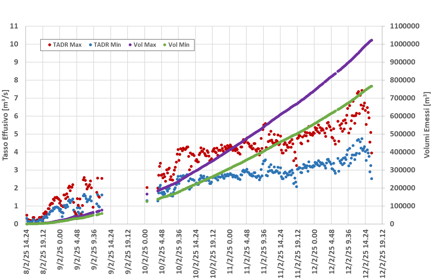 Nel caso della colata lavica analizzata, le misure preliminari effettuate nel periodo 8-12 febbraio suggeriscono che Il tasso di effusione della lava è stato in media compreso tra 2 e 3 metri cubi al secondo con ultimo dato di 3,2 m3/s stimato il 12 febbraio alle 17:00, mentre il volume cumulato ha raggiunto un valore di quasi un milione di metri cubi.