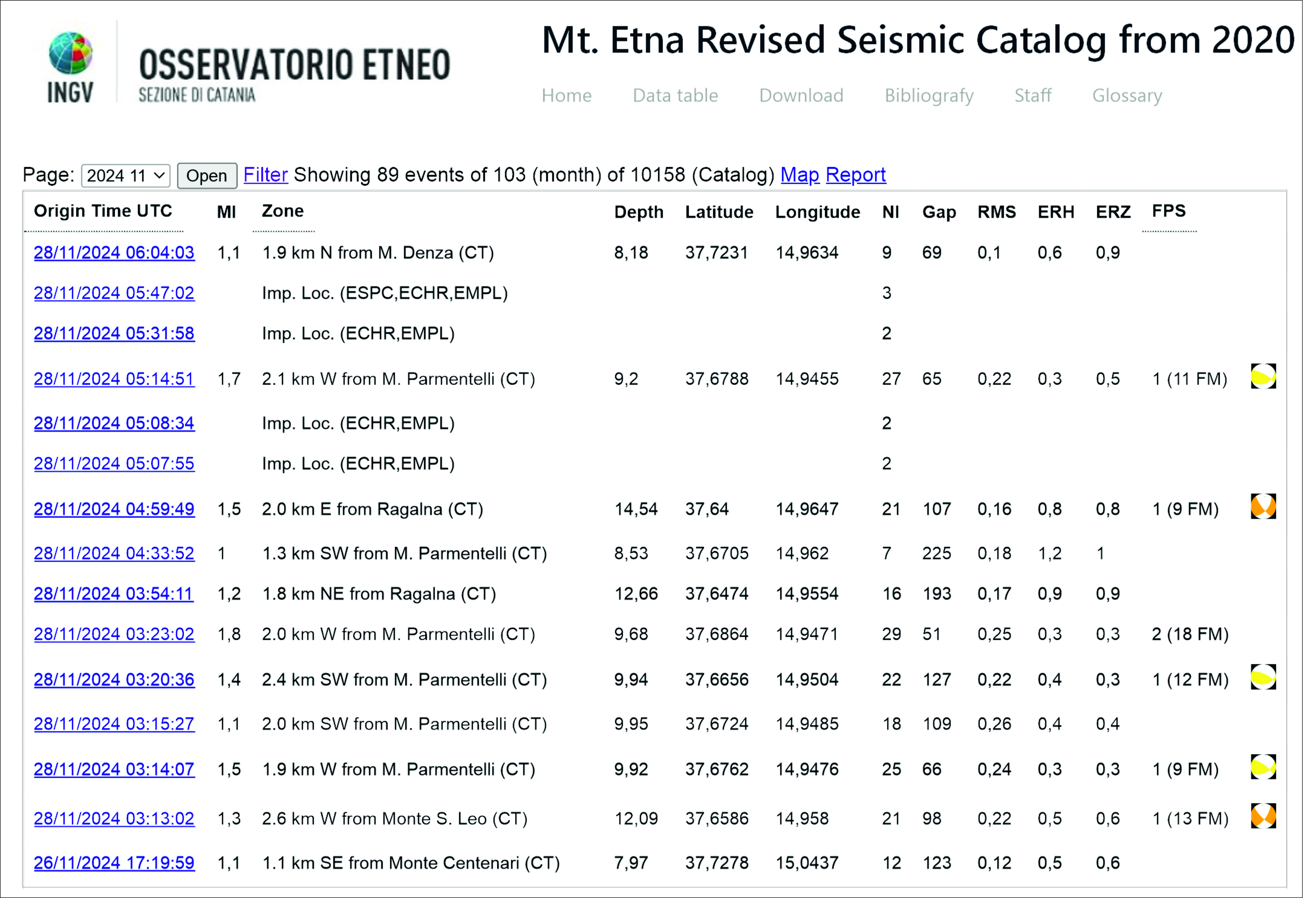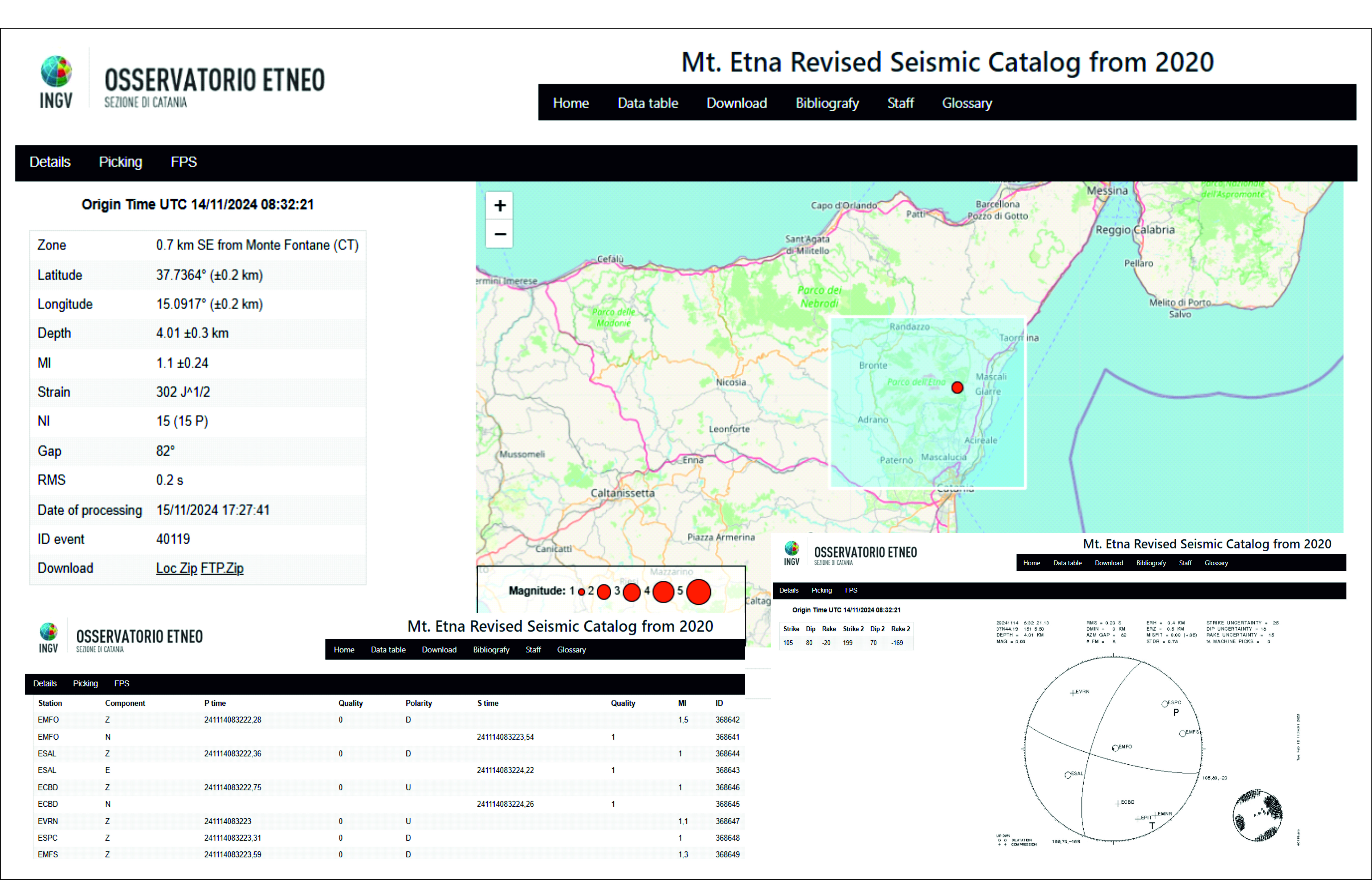 Dal 2020, il catalogo EtnaRSC raccoglie e rende disponibili le informazioni derivate dall’analisi di ogni terremoto registrato (Tempo origine, Latitudine, Longitudine, Profondità, Magnitudo, errori associati; Figura 1) insieme a tutti i dati utilizzati per elaborarle.