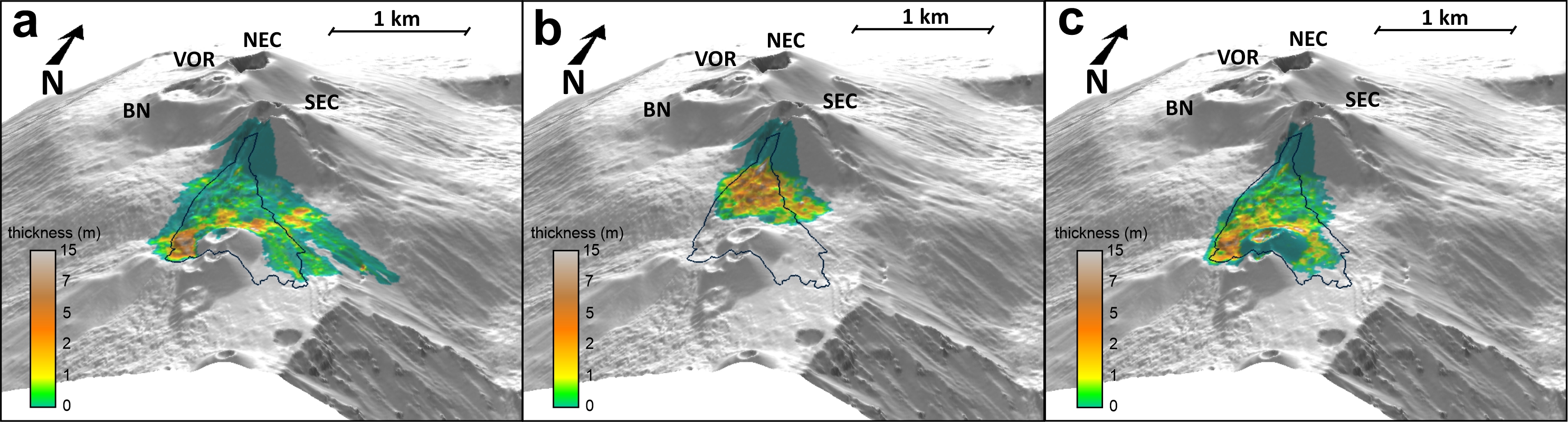 Le osservazioni sono state infine supportate da un modello numerico per la simulazione fisica dei flussi per studiarne meglio le dinamiche di propagazione. I risultati suggeriscono che il materiale piroclastico che costituiva il fianco sud del Cratere di Sud-Est prima del collasso si è accumulato velocemente durante le attività eruttive del 2021 (Figura 6).